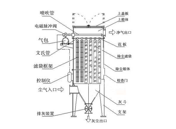單機布袋脈沖除塵器分為五部分: 上箱體:由可掀起的蓋板和出風口組成。 中箱體:由多孔板、濾袋裝置和文氏管組成。 下箱體:由進風口、灰斗和檢查門組成。 排灰系統:由減速裝置和輸灰、排灰裝置組成。 噴吹系統:由控制儀、控制閥、脈沖閥、噴吹管、氣包和防護裝置組成。