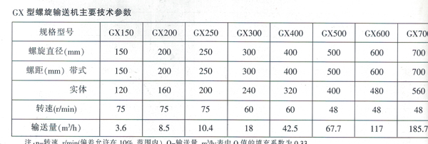 :GX型固定式螺旋輸送機有七種規格。螺旋直徑:150、200、250、300、400、500、600;十種標準轉數(數/分):20、30、35、45、60、75、90、120、150